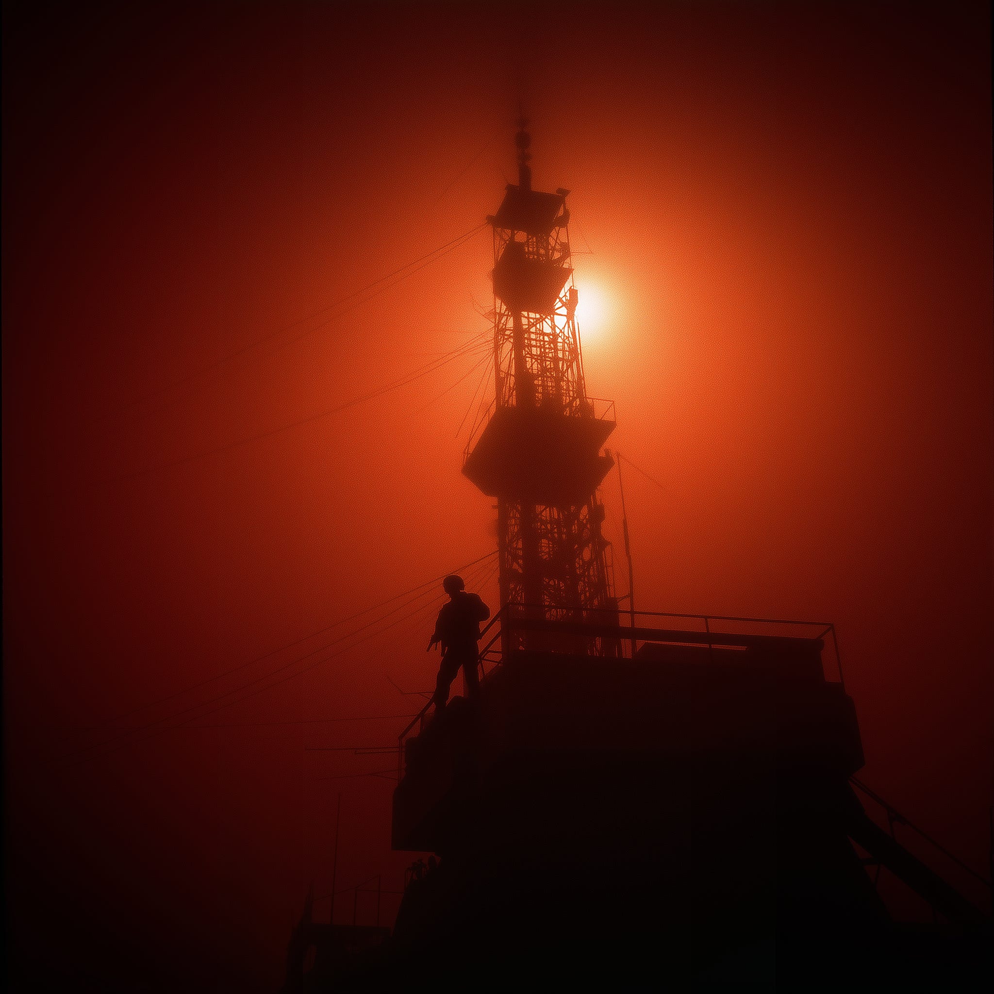 Climbing the tower is a welcome distraction. It is a mechanical movement — up the metal ladder, one hand after the other. At the top, I bathe in the light — that fiery, orange glow. From the top of the tower, the world recedes into darkness. Only a small patch of light is left around me. I can see it shrinking already, closing in.